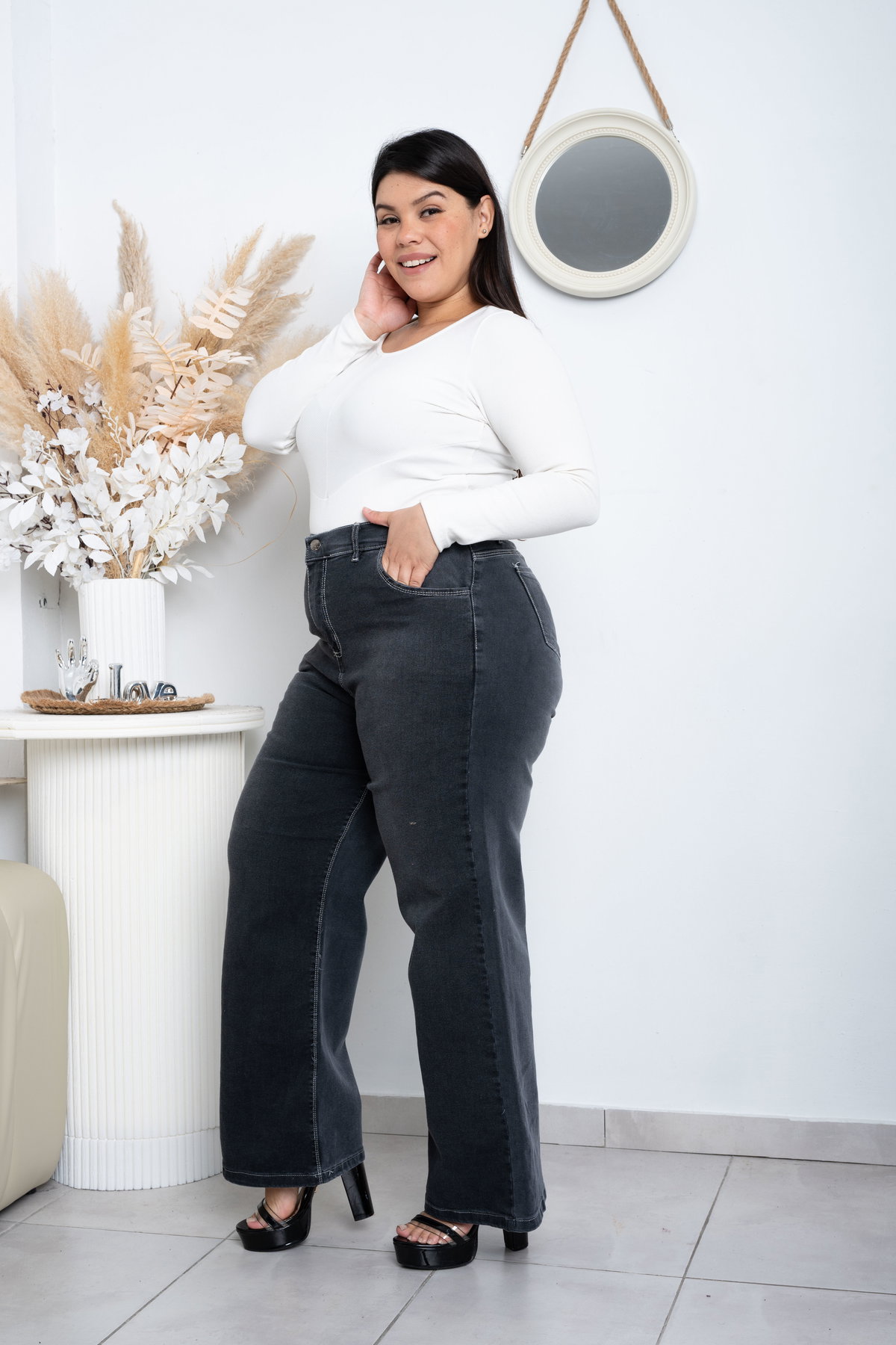 Wideleg Gris Hilo Blanco Elastizado